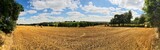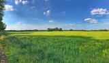 Panoramic view of a lush green meadow under a vibrant blue sky