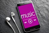 Smartphone With Music App Interface On Screen And White Earphones On Dark Stone Background For Entertainment And Technology Concepts