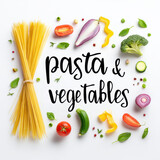 Raw Pasta And Fresh Vegetables Isolated On White Background With Decorative Lettering For Food And Recipe Illustrations