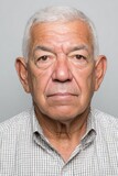 Senior Serbian man ID portrait with white hair wearing plaid shirt, neutral expression