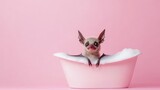Adorable baby bat bathing in a pink tub with foam bubbles