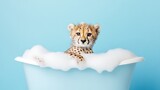 Cute cheetah cub enjoying a bubble bath in a blue bathtub
