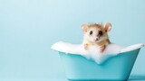 Adorable rat enjoying a foamy bubble bath in a tiny turquoise bathtub