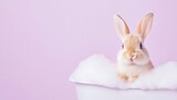 Adorable bunny sitting in bathtub surrounded by bubbles and soap foam