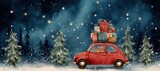• Cartoon red car carrying holiday presents through a snowy forest at night