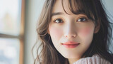 Close-up of a woman with long hair looking out the window in a cozy atmosphere