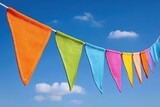 Colorful fabric bunting against a bright blue sky with soft white clouds