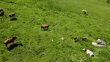 Drone Shot of Alpine Cows and Calves Grazing on Green Pastures in Austrian Alps