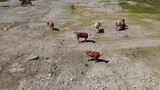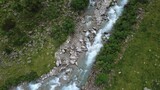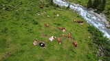 Aerial Drone View of Cows Grazing by a Rushing River in the Austrian Alps
