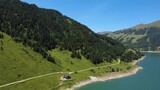 Aerial View of Serene Koenigsleiten Lake and Lush Green Mountains in the Austrian Alps.