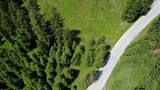 Aerial Drone View of a Serene Forest Path in the Lush Austrian Alps During Summer.