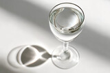 Clear wine glass casting intricate shadows on a plain white background