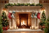 • Cozy fireplace with Christmas stockings and holiday decorations