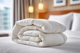 Neatly folded white duvet on a bright, comfortable bed in natural light