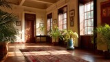 Bright empty room interior with sunlight streaming on wooden clean floor