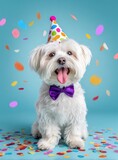 Cheerful Maltese dog celebrating in festive hat and purple bow tie
