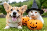 Corgi and cat dressed up with pumpkins for fun Halloween celebration