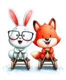 Happy cartoon rabbit and fox sledding in a winter wonderland