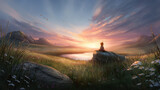 Child sitting on a rock, looking at a colorful sunset over a meadow