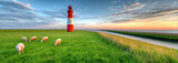 Idyllic rural landscape with lighthouse and grazing sheep at sunset