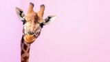 Giraffe curiously peeking out from behind a pastel pink wall corner