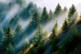 • Majestic forest landscape with mountains and morning mist under soft sunlight