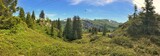 • Panoramic forest landscape with sunlit trees and lush green vegetation