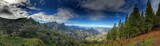 • Panoramic view of lush green mountains and trees under bright sky