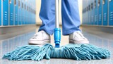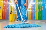 Professional cleaning worker mopping floor in brightly colored locker hallway