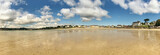 Panoramic view of sandy shore with water reflections and a sunny sky