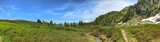 Panoramic view of green alpine landscape with mountains and lush meadow