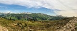 Panoramic alpine landscape with lush green meadows and dramatic mountain views