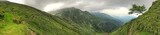 Panoramic mountain landscape featuring lush greenery and moody weather conditions