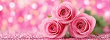 Three Pink Roses On Glitter Surface With Bokeh Lights Background For Valentine's Day And Romantic Occasions Love And Celebration Themes