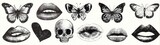 Assorted hand-drawn butterflies, lips, skull and heart collage for creative fashion and design projects