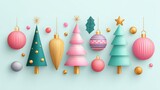 Christmas Trees And Baubles Ornaments On Light Blue Background For Festive Holiday Season Decorations And Celebrations