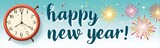 Festive Happy New Year Banner With Clock And Fireworks On Light Blue Background For Holiday Greetings And Celebrations Design