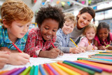 Group of children and their teacher drawing together at a table with colorful pencils in a bright classroom