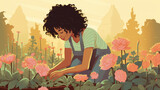 Queer woman tending to her blooming garden illustration