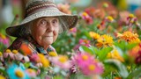 Elderly woman tenderly caring for her vibrant garden full of colorful flowers
