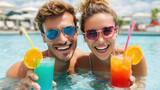 Smiling Couple With Cocktails In Swimming Pool On Vacation Holding Drinks With Orange Slices And Straws Enjoying Summer Holiday Togetherness