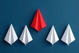 • Red Paper Airplane Leading White Ones On Blue Background For Leadership Innovation And Business Concepts Standing Out From The Crowd