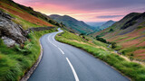 Winding mountain road during sunrise with lush greenery and vibrant colors