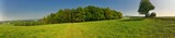Wide panoramic header of a green meadow with trees and clear blue sky