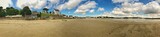 Panorama view of riverfront buildings under cloudy skies in a European city