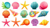 Collection of colorful cartoon seashells, starfish, and ocean-inspired designs