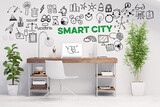 Schreibtisch mit Schriftzug „Smart City“ als Konzept
