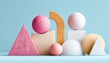 Abstract arrangement of pastel geometric shapes on a light blue background