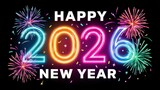Neon 2026 new year celebration with fireworks and glowing colorful decorations
