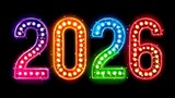 Colorful illuminated 2026 sign with vibrant neon lights on black background
